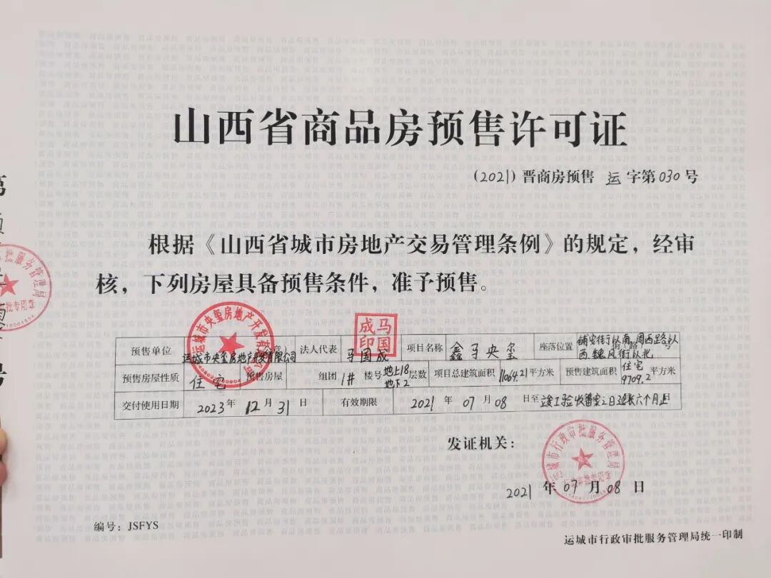 喜讯 鑫马央玺 首批预售证 成功获批 五证齐全,恭迎品鉴 五证齐全,众望所归 作为运城的地王,鑫马央玺 承载了太多期许的目光,怎敢轻易辜负? 从《建设用地规划许可证》、《不动产权证》 《建设工程规划许可证》到《建筑工程施工许可证》 再到现在的《商品房预售许可证》 鑫马央玺经过无数个日夜的不懈努力 为广大购房者献上一份安心大礼 恪守承诺,品质兑现 五证齐全让我们看到 鑫马央玺回馈给大家的 绝不仅仅只是一句承诺而已! 更是践行责任的行动力 我们坚信鑫马的雄厚资金和实力 也更加憧憬着,有这样一个强大后盾 鑫马央玺一定会建设的更加美好 在最好的未来,等待最好的您